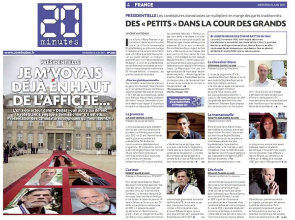 Article paru dans le 20 Minutes du 5 juin 2011 sur les « petits » candidats à l’élection présidentielle de 2012. L’article détaille les idées de 5 candidats ayant des objectifs complètement différents mais un point commun : utiliser la campagne présidentielle pour faire parler de leurs idées.
