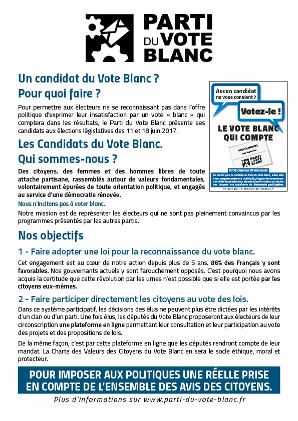 Pour faire face aux carriéristes politiciens qui transforment le mandat reçu de leurs électeurs en métiers à vie, le Parti du Vote Blanc à présenté 82 candidats citoyens aux élections législatives des 11 et 18 juin 2017.